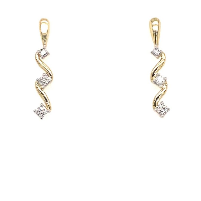 9ct Yellow Gold Three Stone Diamond Wavy Drop Earrings