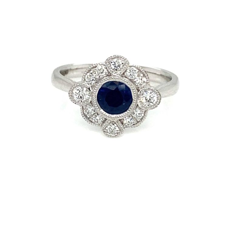 Platinum Round Sapphire & Diamond Vintage Style Cluster Ring