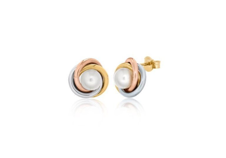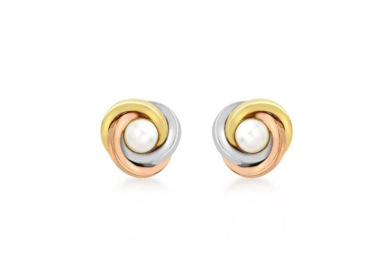 9ct Three Colour Gold Knot Pearl Stud Earrings