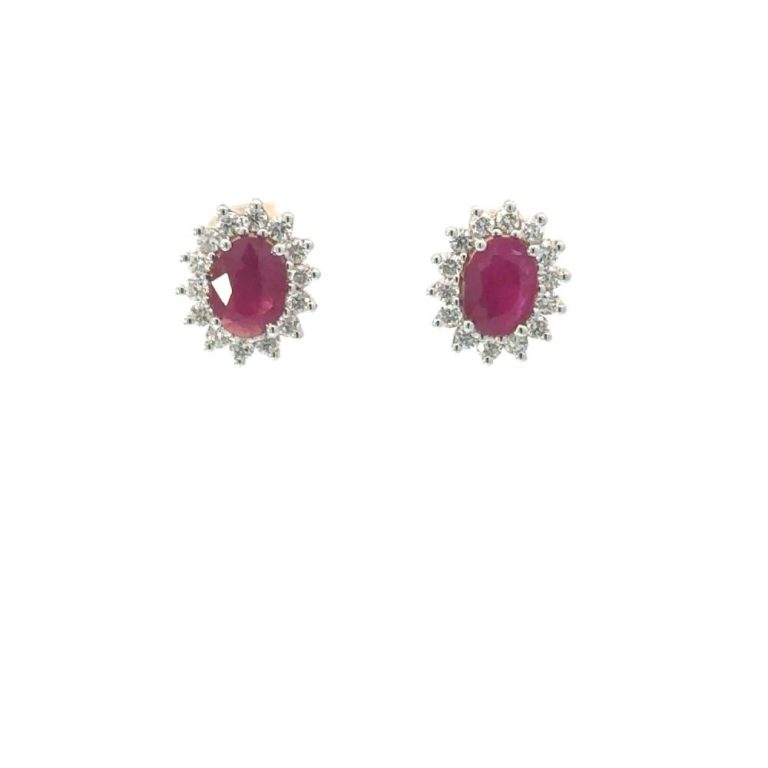 18ct Yellow Gold Oval Ruby & Diamond Cluster Stud Earrings
