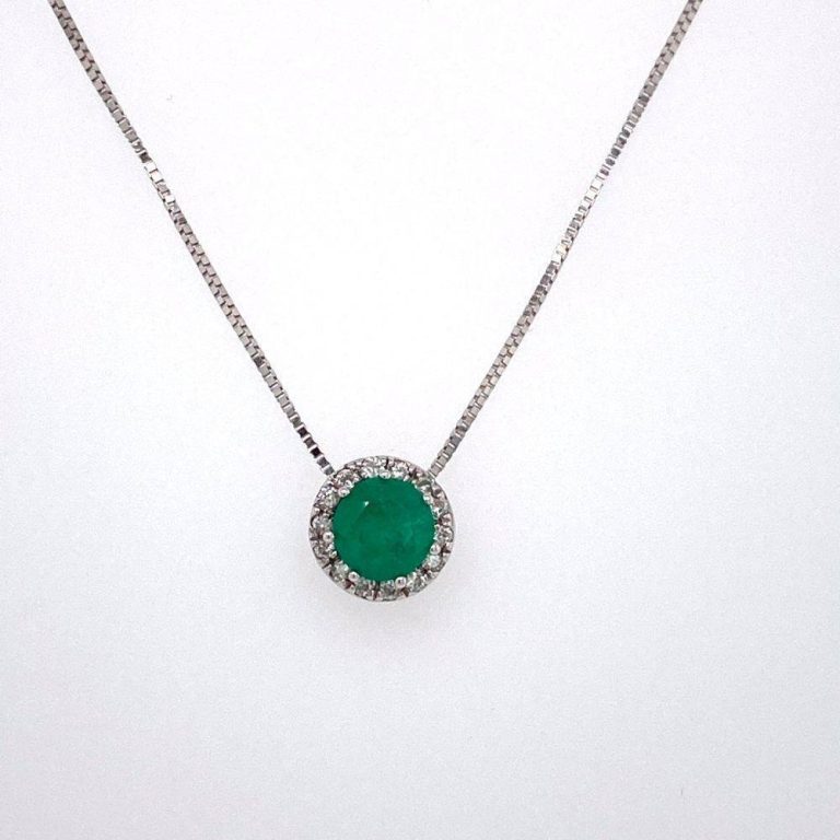 9ct White Gold Round Emerald & Diamond Halo Pendant