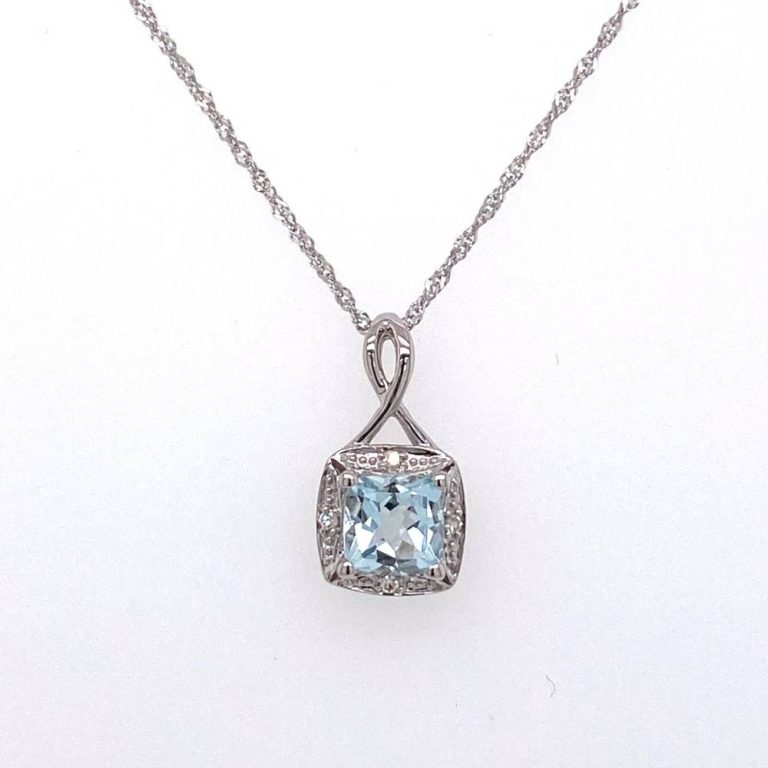 9ct White Gold Square Aquamarine & Diamond Pendant