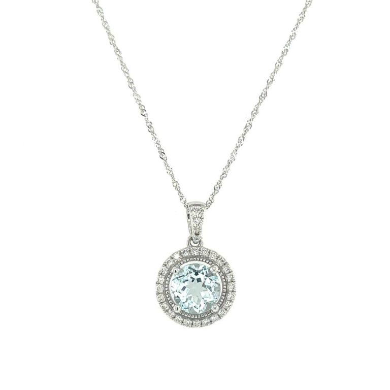 9ct White Gold Round Aquamarine & Diamond Pendant