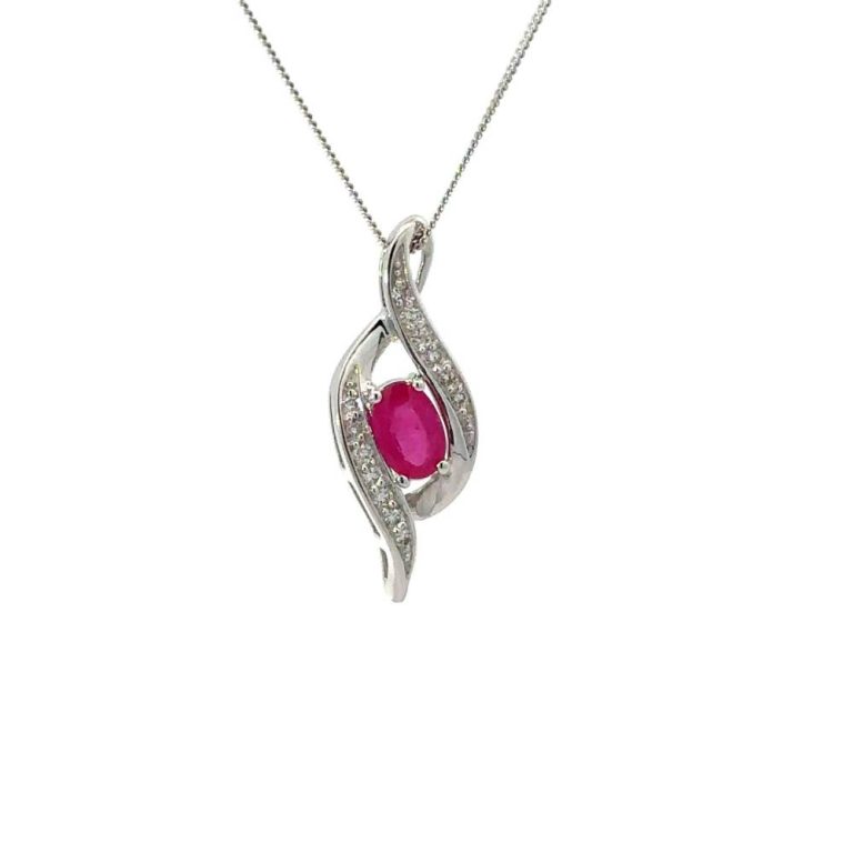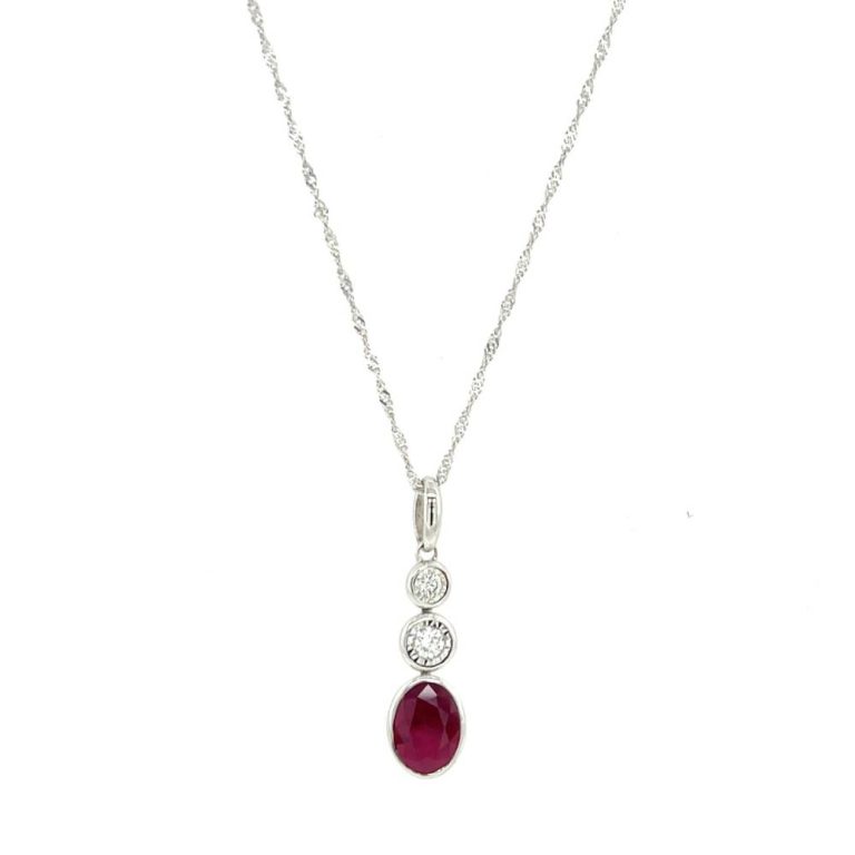 9ct White Gold Ruby & Diamond Three Stone Drop Pendant