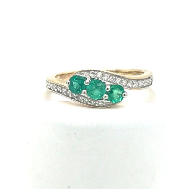 9ct Yellow Gold Three Stone Emerald & Four Diamond Ring