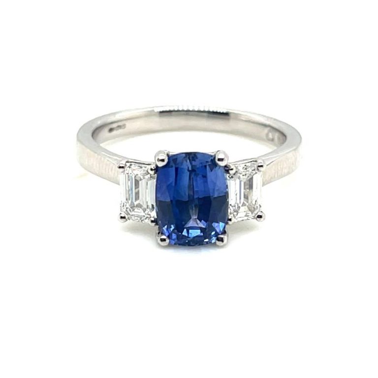 Platinum Cushion Shaped Sapphire & Diamond Three Stone Ring