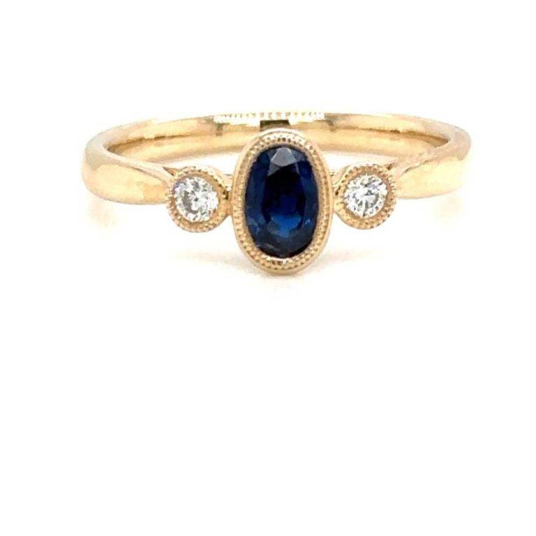 9ct Yellow Gold Three Stone Oval Sapphire & Diamond Ring