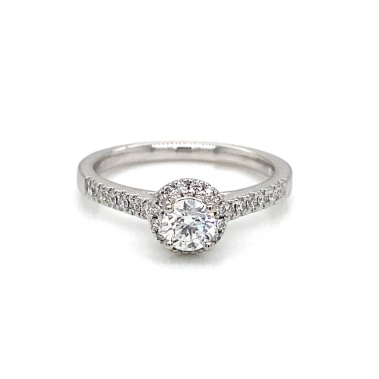 Platinum Round Brilliant Cut Diamond Ring with Diamond Set Shoulders