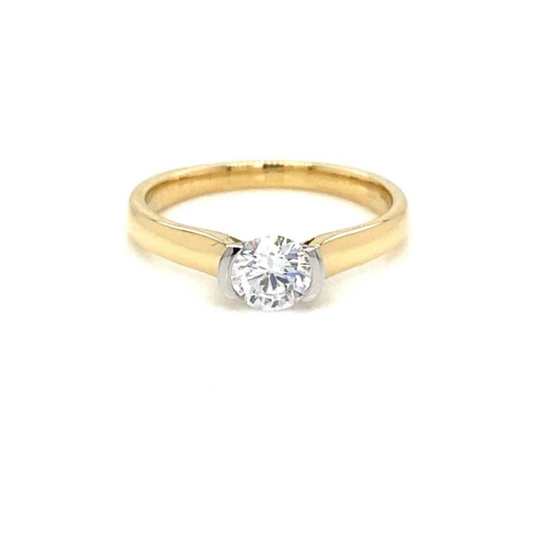 18ct Yellow Gold & Platinum Single Stone Diamond Half Rub Over Set Ring