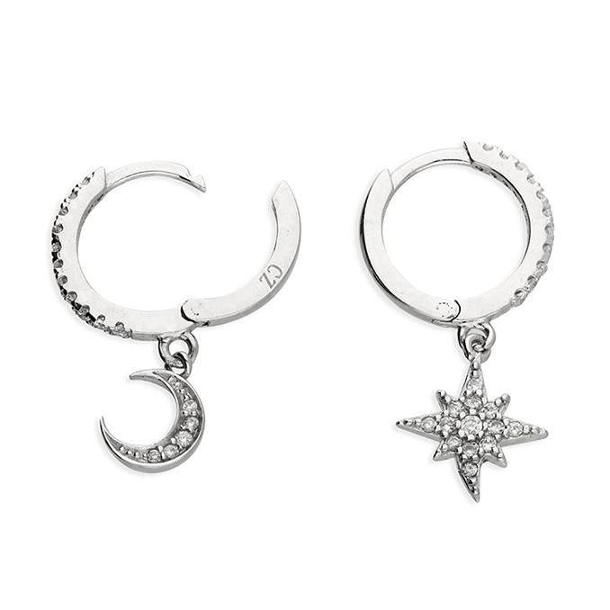 Sterling Silver Moon & Stars Cubic Zirconia Huggie Earrings