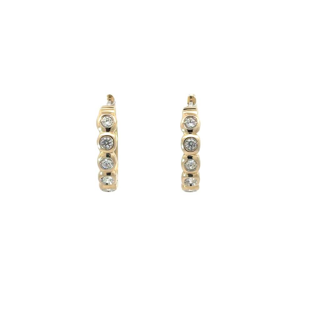 14ct yellow gold five stone round brilliant cut diamond rub over set hoop earrings. 0.37ct total diamond weight.