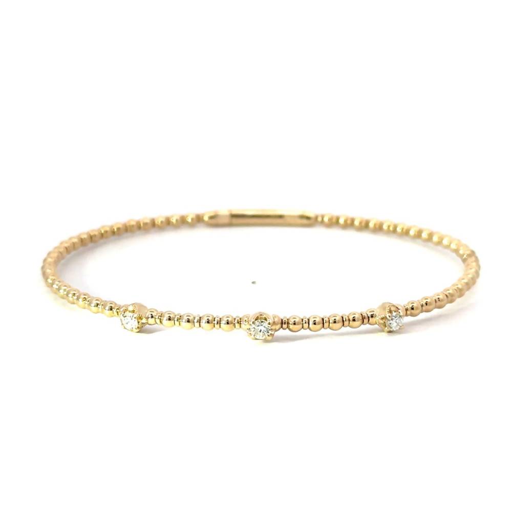 14ct yellow gold flexible bangle set with three round brilliant cut diamonds each claw set. This bangle has a hidden push in catch. 0.21ct total diamond weight.