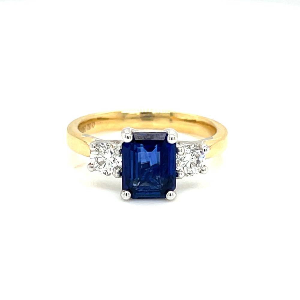 A central octagonal blue sapphire with a round brilliant cut diamond either side claw set in platinum on a 18ct yellow gold shank. Sapphire 1.97ct and diamonds 0.52ct total weight.