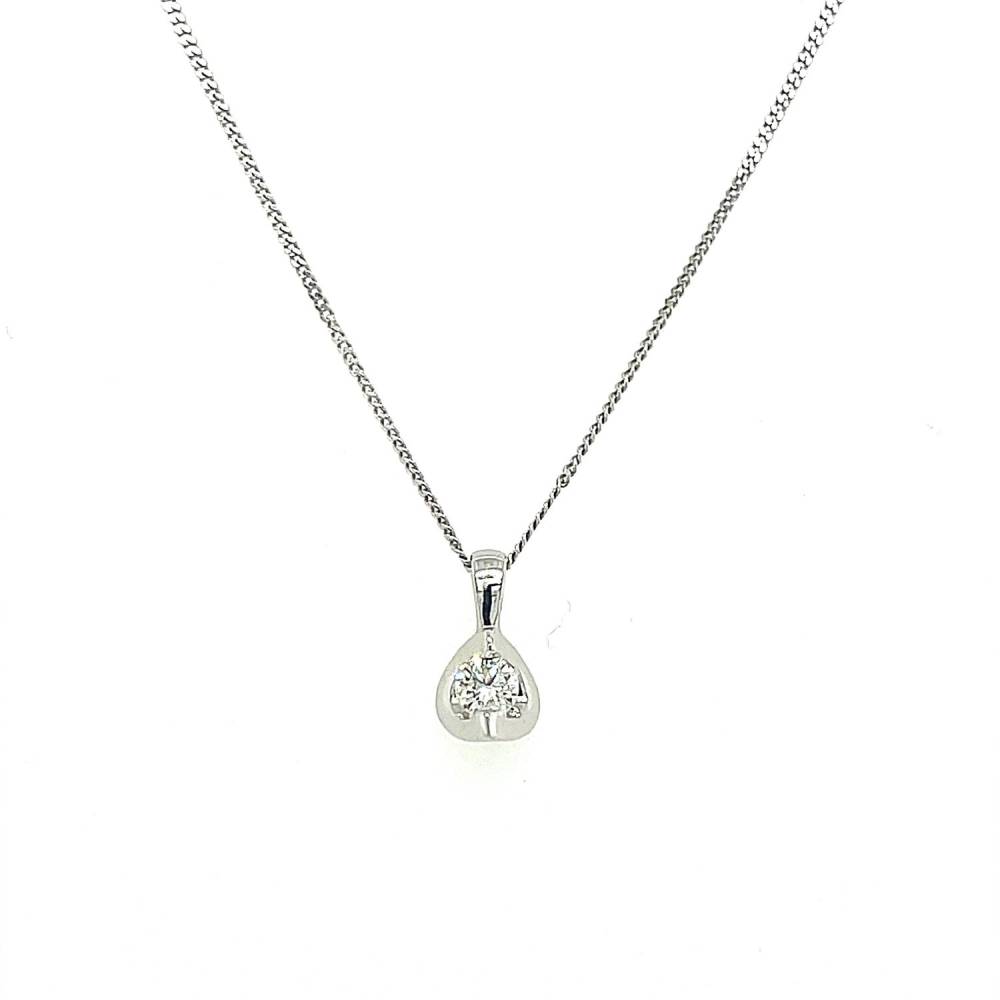 18ct white gold 0.15ct round brilliant cut diamond pendant in an arch shaped setting. This pendant comes on a 18″ white gold chain.