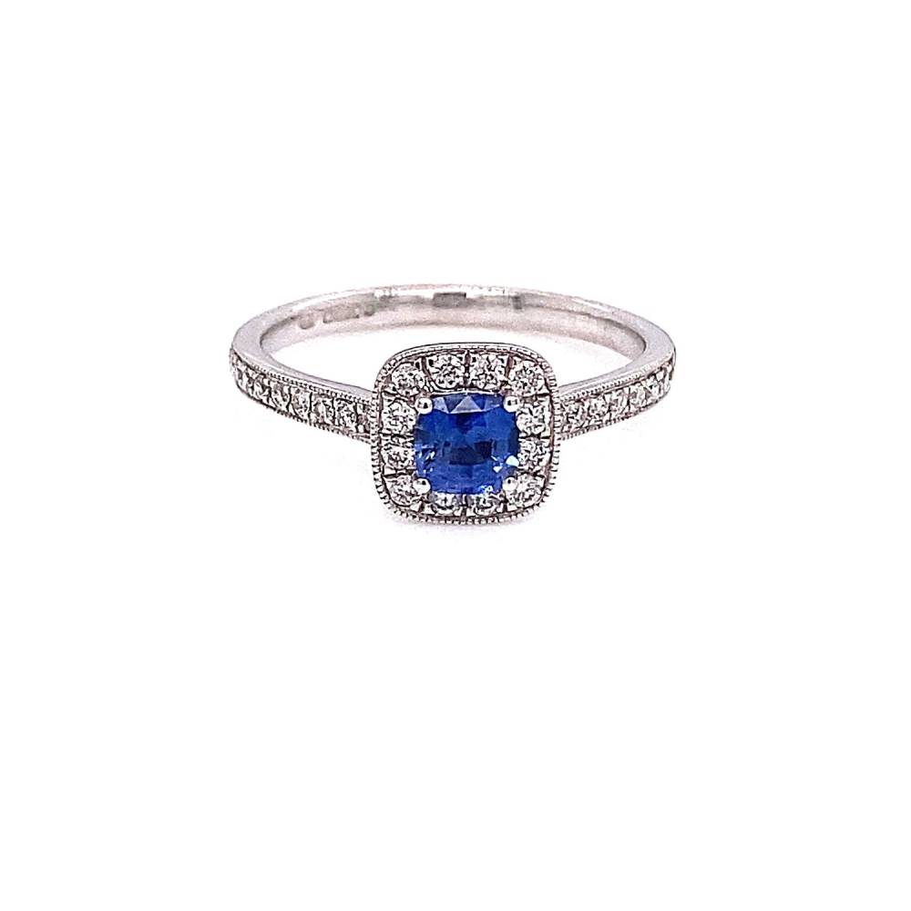 18ct white gold cushion shaped blue sapphire surrounded by a halo of round brilliant cut diamonds with diamond set shoulders. Diamonds are set in a grain setting with a fine millegrain edge. Sapphire 0.34ct and diamonds 0.25ct total weight.