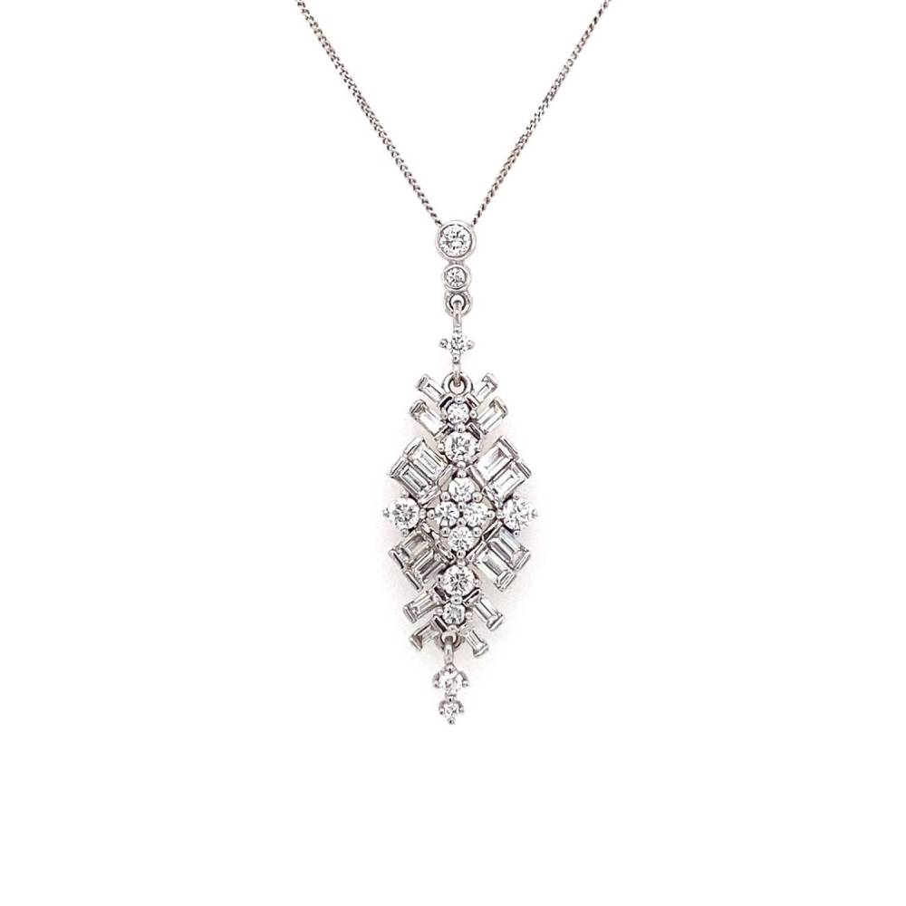 18ct white gold fancy long Art Deco style pendant set with a mixture of round brilliant cut diamonds and baguette cut diamonds. This pendant comes on a 18″ 18ct white gold chain. 1.03ct total diamond weight.