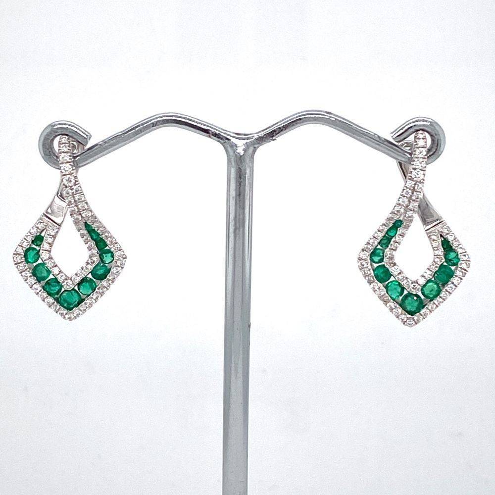 18ct white gold fancy open diamond shaped hoop style earrings set with round brilliant cut diamonds and round emeralds. 0.58ct tota emerald weight. 0.41ct total diamond weight.