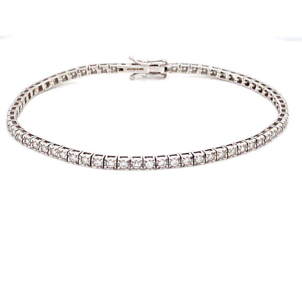 18ct white gold illusion set round brilliant cut diamond tennis bracelet with a push in hidden catch and two safety arms. 0.95ct total diamond weight.