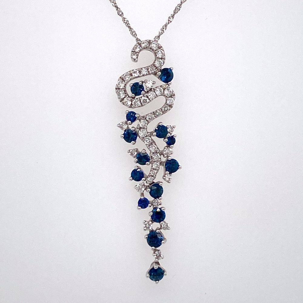 A long sapphire and diamond statement pendant set with round brilliant cut diamonds and round sapphires. A real statement piece of jewellery, make even more of a statement with the matching earrings. This pendant comes on a 16″” 9ct white gold square trace chain. 0.97ct total sapphire weight. 0.48ct total diamond weight.