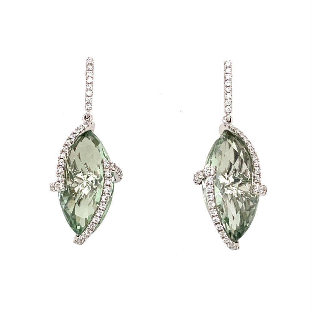 18ct white gold marquise green amethyst drop earrings with round brilliant cut diamonds.