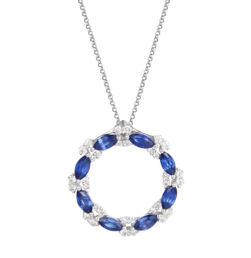 18ct white gold sapphire and diamond open circle pendant set with marquise shaped blue sapphire and round brilliant cut diamonds. This pendant comes on a 18ct white gold 46cm chain which can be worn at 46cm, 43cm or 41cm. 1.30ct total sapphire weight and 0.50ct total diamond weight.