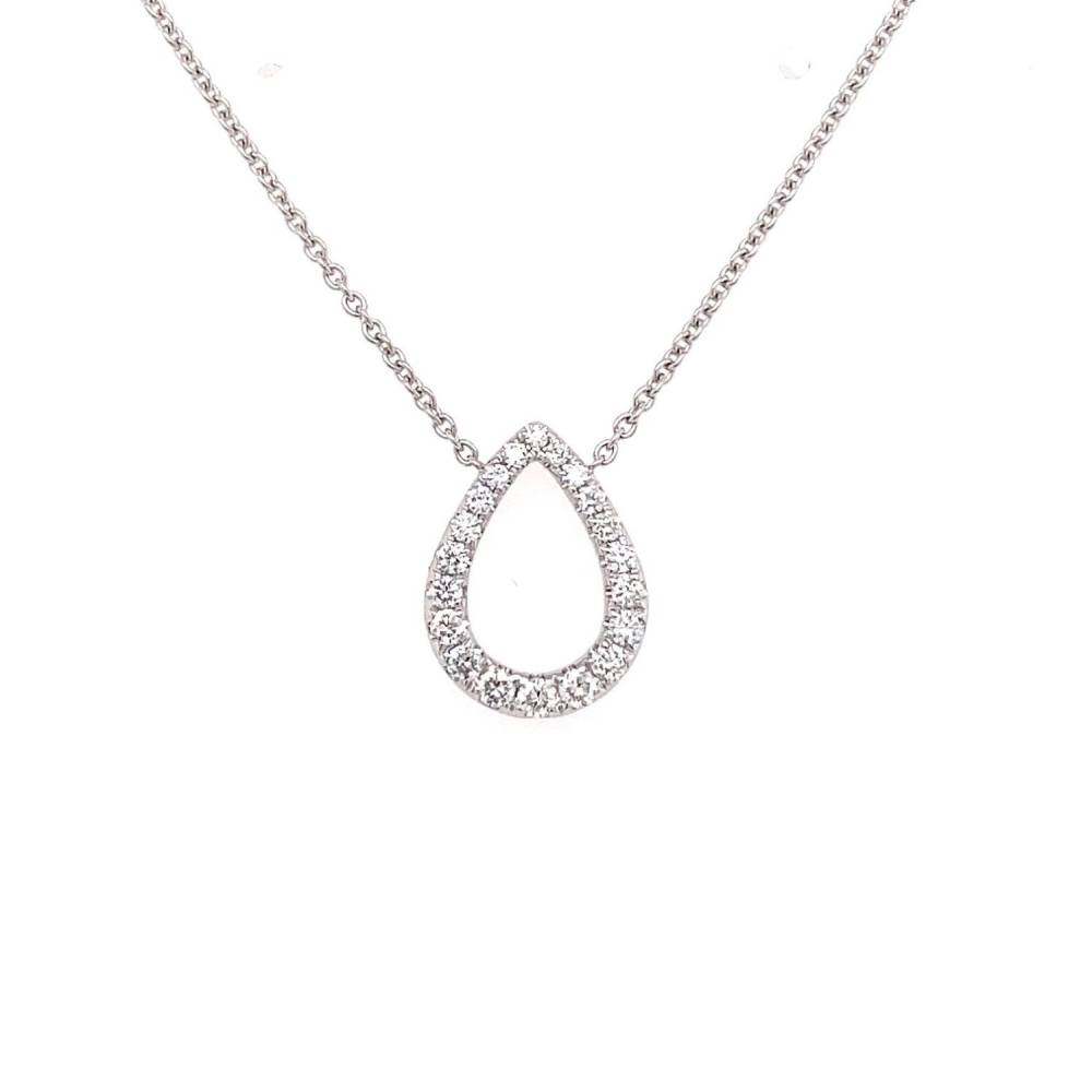 An open teardrop shape set with graduated round brilliant cut diamonds fixed onto a 18ct white gold adjustable length 15-16″ chain. 0.29ct total diamond weight.