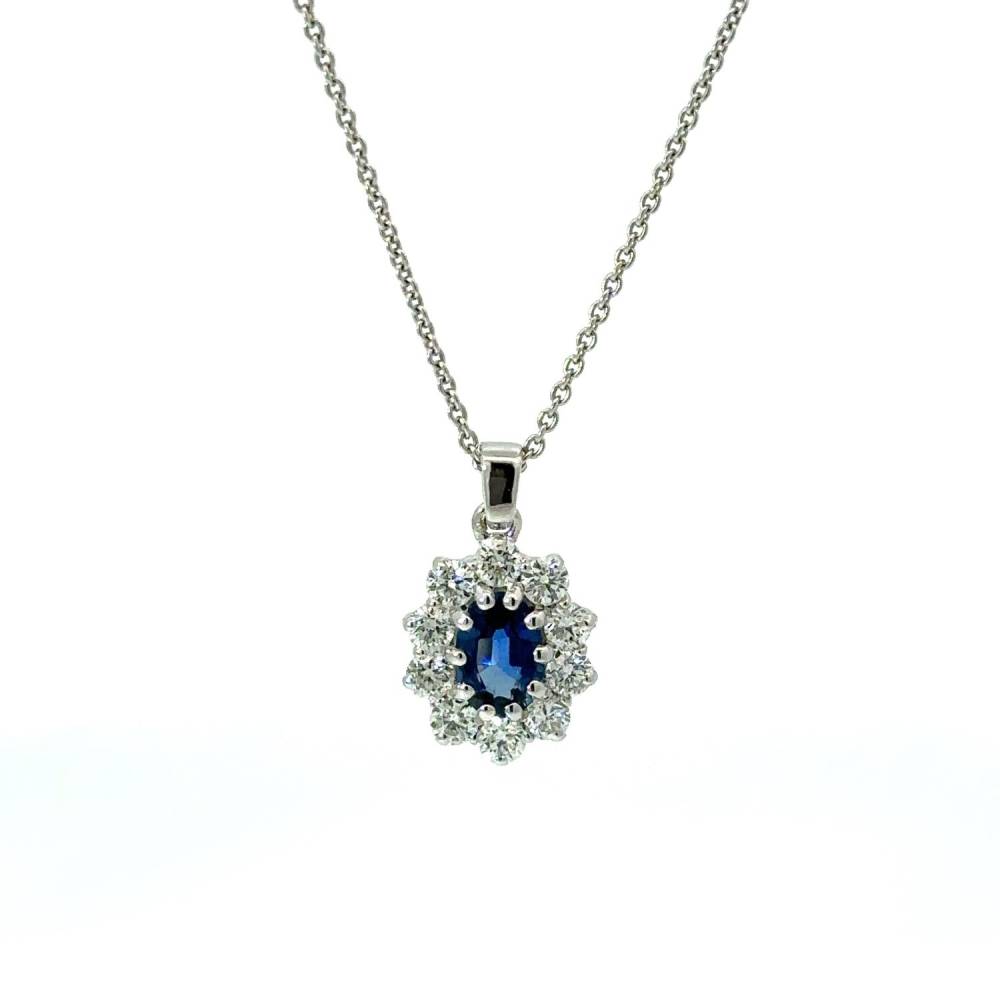 An oval 0.74ct blue sapphire sits in the centre of ten round brilliant cut diamonds to make this beautiful cluster pendant set in 18ct white gold. This pendant comes on an 18ct white gold 16-18″ chain. 0.74ct sapphire and 0.67ct total diamond weight.