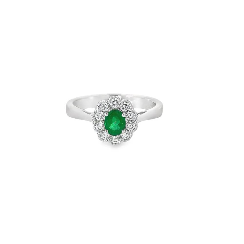 18ct white gold oval emerald and round brilliant cut diamond cluster ring with a millegrain edge. 0.36ct emerald and 0.28ct total diamond weight.