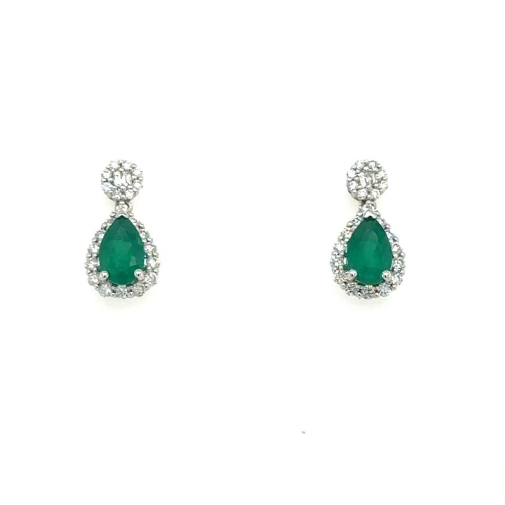 18ct white gold pear shaped emerald and diamond halo cluster earrings with a smaller diamond cluster set above with round brilliant cut and baguette cut diamonds. Small drop earrings with a stud fitting. 1.23ct total emerald weight and 0.47ct total diamond weight.