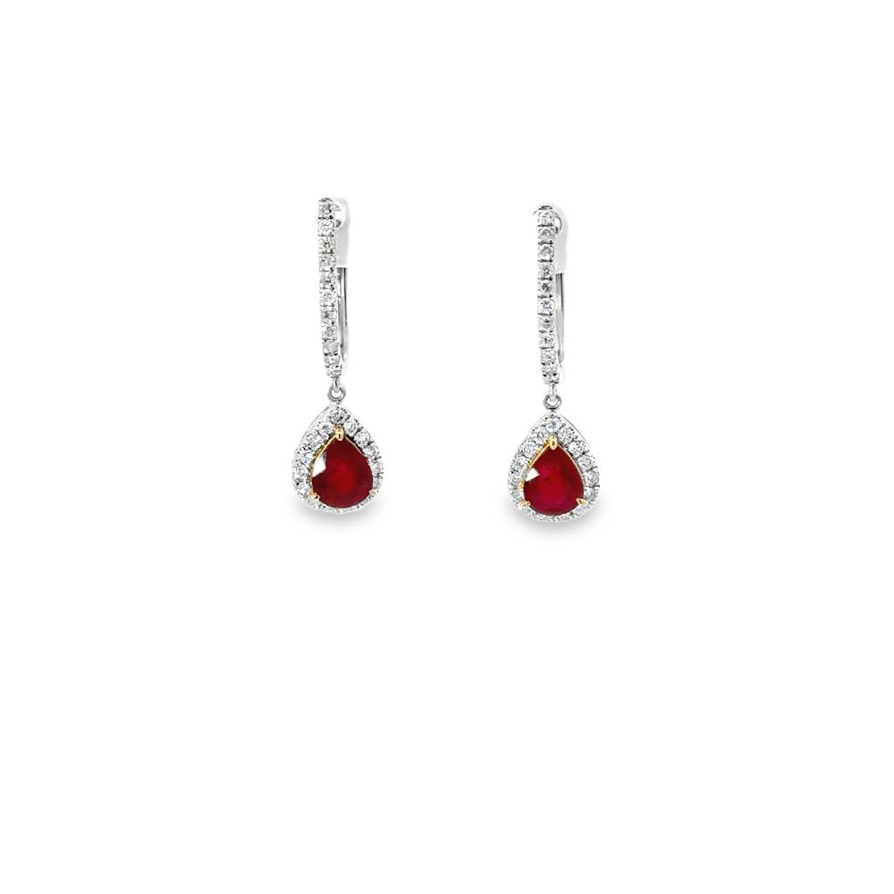 18ct white gold pear shaped ruby and diamond halo cluster hoop drop earrings. Each earring is set with a central pear shaped ruby in yellow gold which is surrounded by a halo of smaller round brilliant cut diamonds set in white gold on a hoop style fitting also sent with round brilliant cut diamonds in 18ct white gold. 1.33ct total ruby weight and 0.42ct total diamond weight.