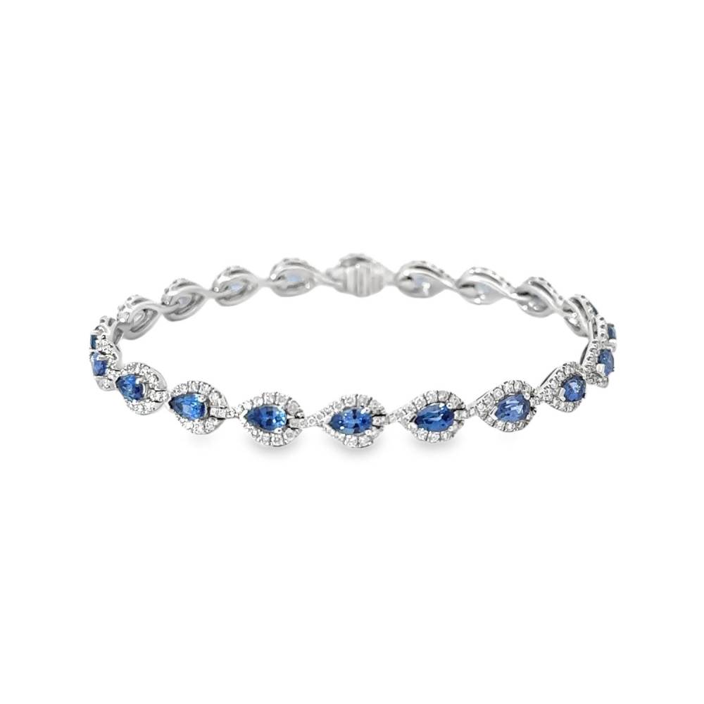 18ct white gold pear shaped sapphire and round brilliant cut diamond cluster bracelet with a push in catch and hidden safety catch. 5.36ct total sapphire weight. 1.96ct total diamond weight.
