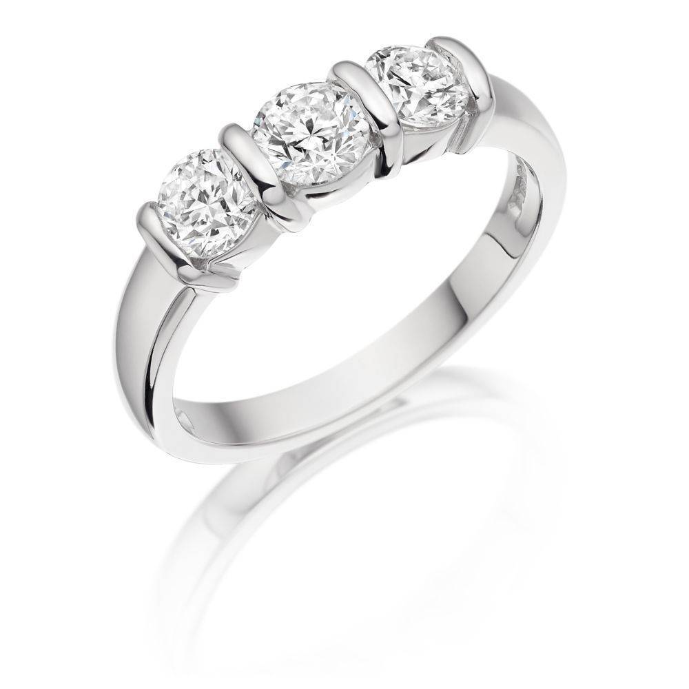 18ct white gold three stone round brilliant cut diamond ring in a bar setting. Total diamond weight 0.70ct. Approximately G/H colour.