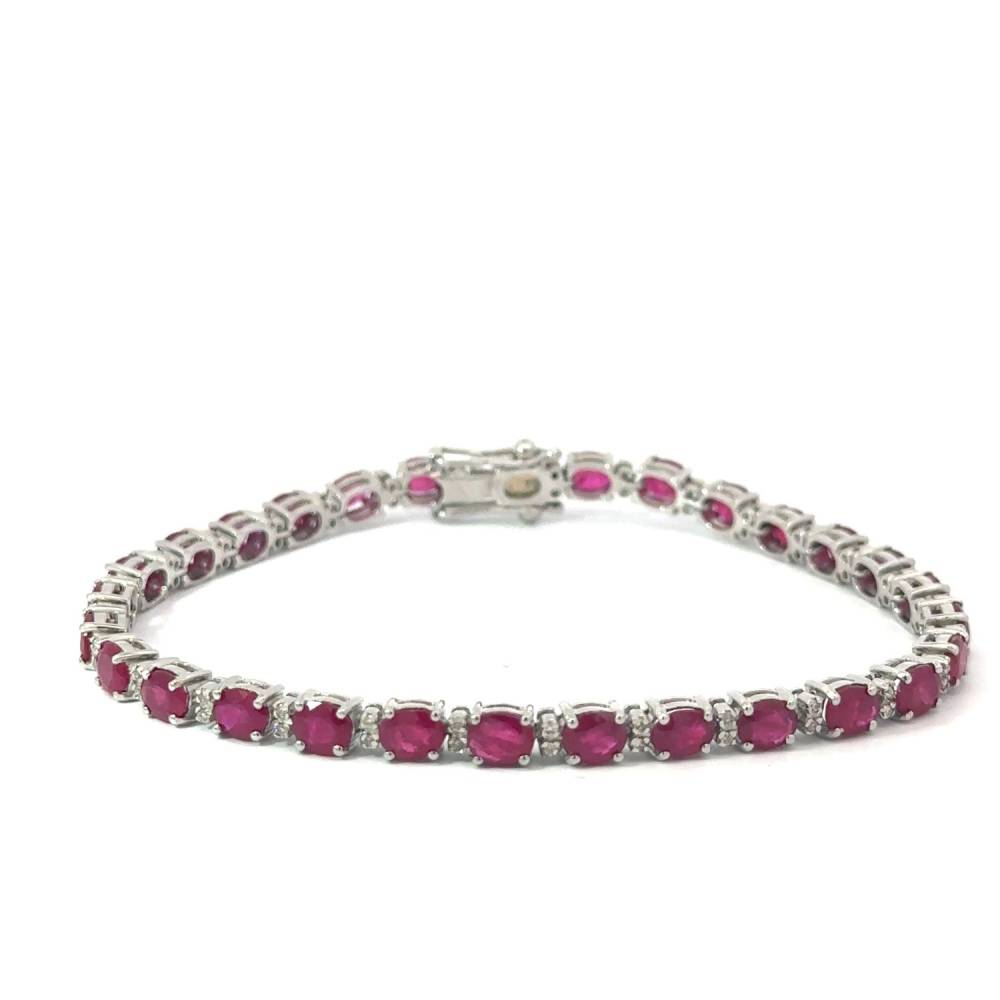 An 18ct white gold ruby and diamond bracelet set with alternate oval ruby and two round brilliant cut diamonds. This bracelet is a flexible style and has an easy push in catch and secures with two saftey arms. 9.50ct total ruby weight and 0.30ct total diamond weight.