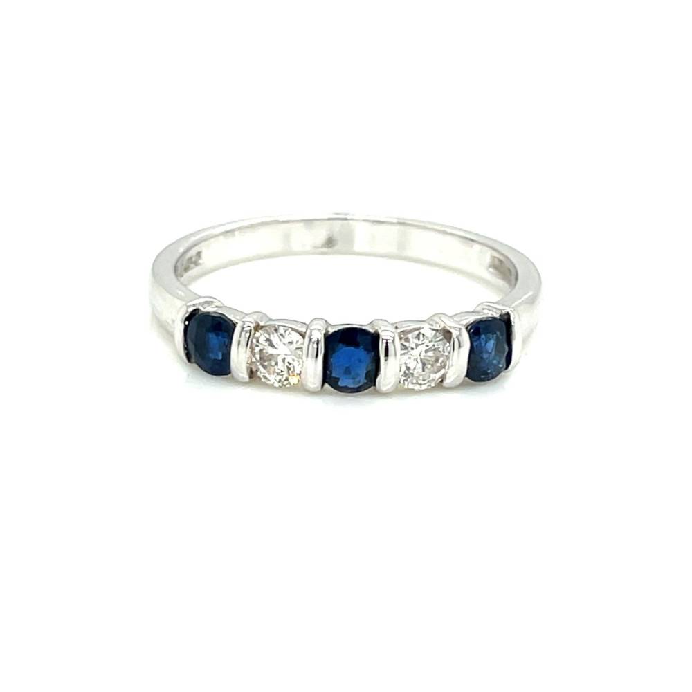 18ct white gold round sapphire and round brilliant cut diamond bar set five stone ring. Sapphire 0.57ct total weight and diamonds 0.20ct total diamond weight.
