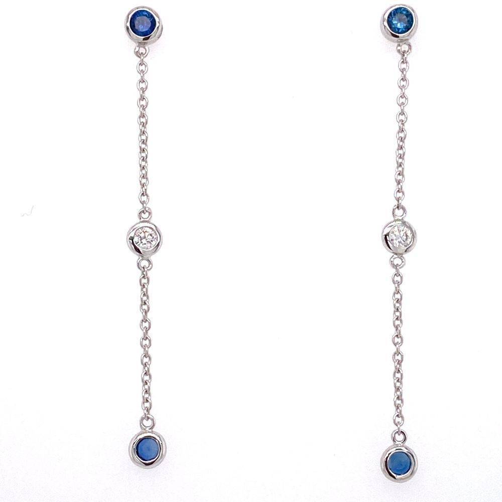 18ct white gold long chain drop earrings set with a round brilliant cut diamond and two round blue sapphires all set in a rub over setting. 0.09ct total diamond weight. 0.32ct total sapphire weight.