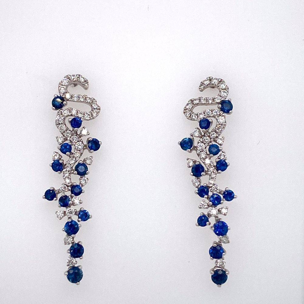 A stunning pair of sapphire and diamond long statement drop earrings. A long swirl of round brilliant cut diamonds is complimeted with round blue sapphires. All set in 18ct white gold earrings with pillar and scroll fittings. 1.54ct total sapphire weight. 0.71ct total diamond weight. Matching necklace available.