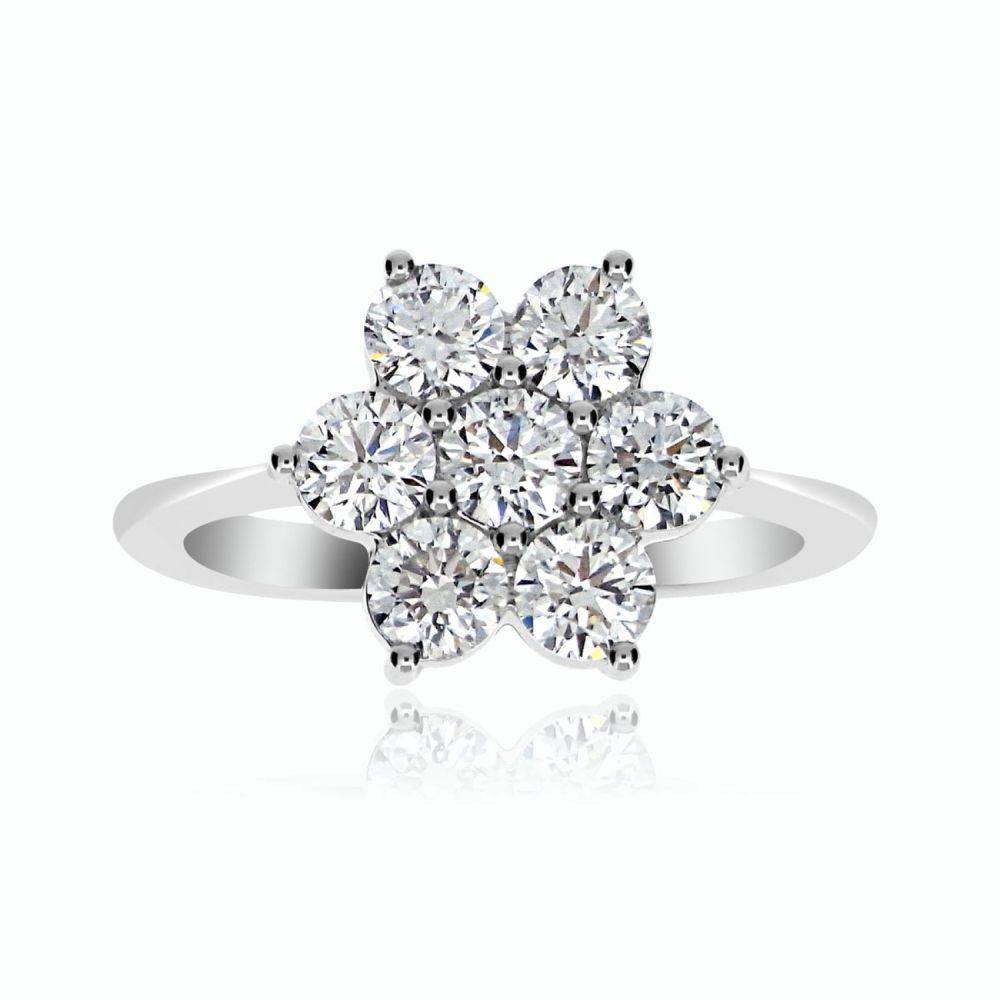 18ct white gold seven stone round brilliant cut diamond petal cluster ring in a claw setting. Total diamond weight 2.06ct. Approximately H colour. Si clarity.