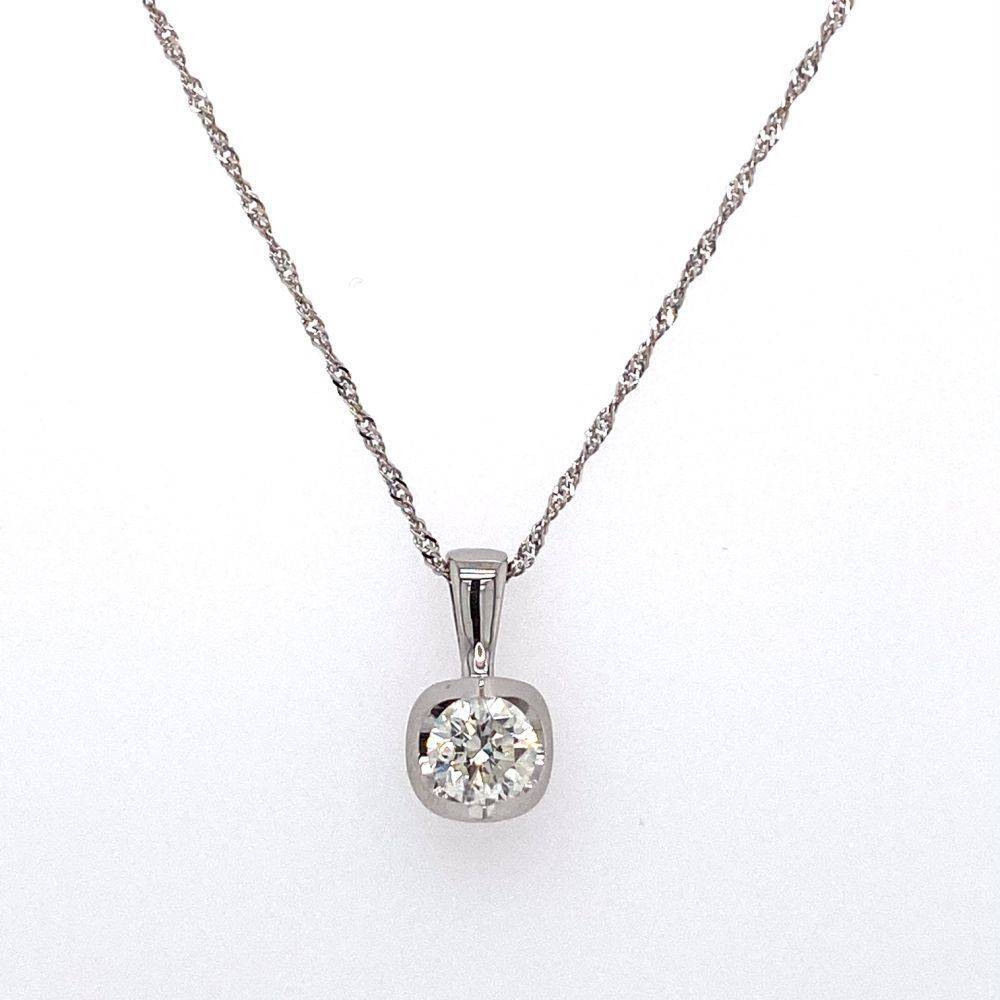 18ct white gold single stone round brilliant cut diamond set in a arch set pendant on a 16″” 9ct white gold twist curb chain. 0.40ct totall diamoond weight. Approximatley G/H colour. Si clarity.