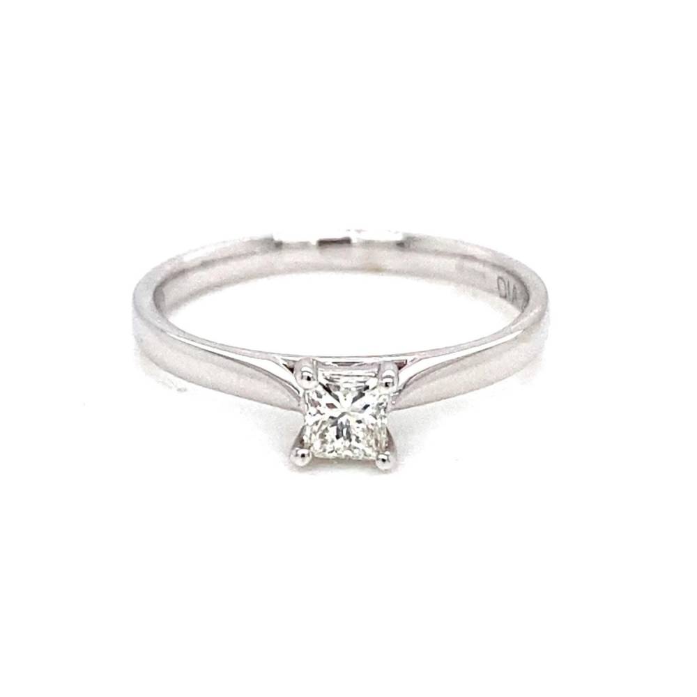 Single 0.25ct princess cut diamond four claw set in a 18ct white gold ring mount.