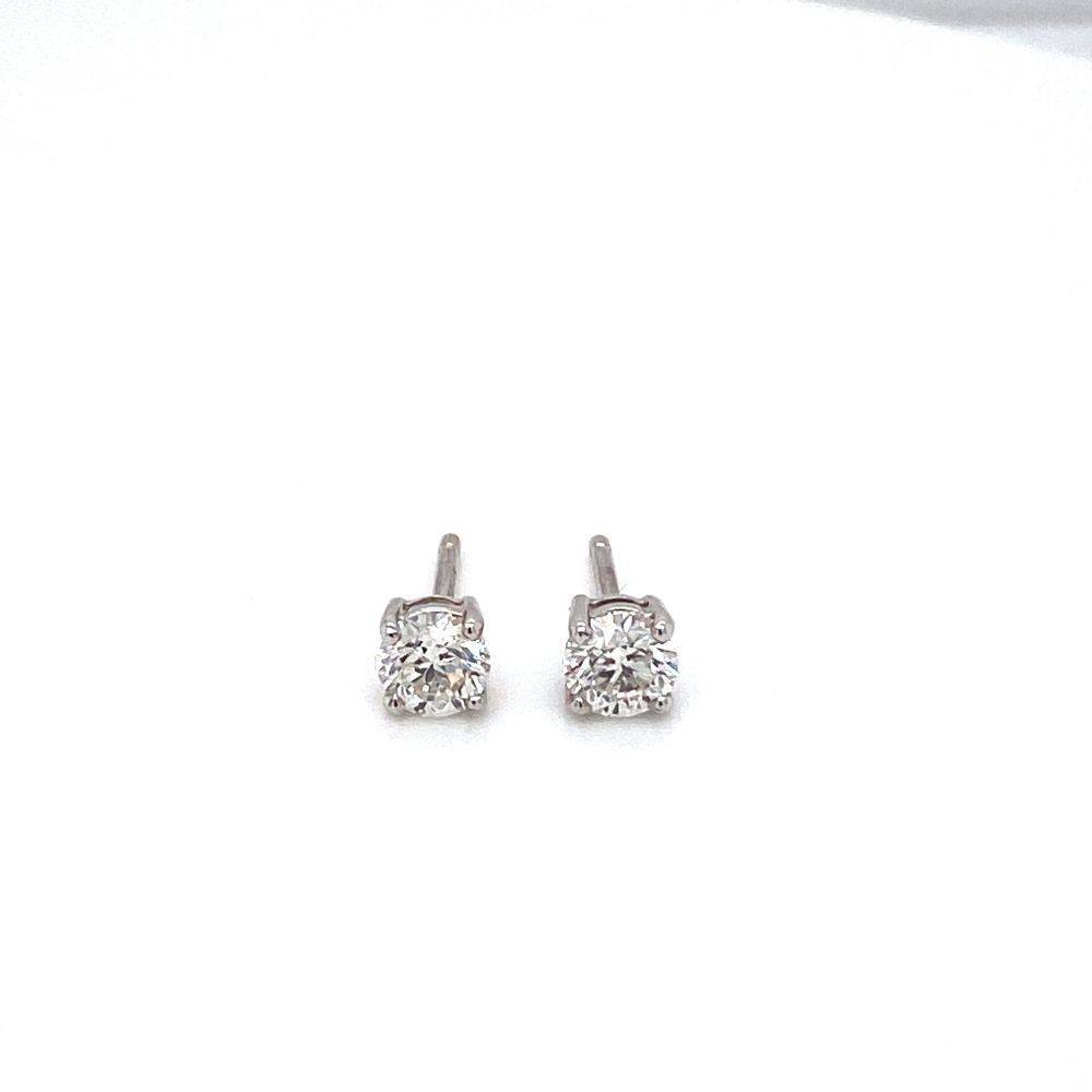 18ct white gold single stone round brilliant cut diamond four claw set stud earrings, with pillar and scroll fittings. 0.80ct total diamond weight, (0.40ct in each earrings). Approximately G/H colour. SI/I1 clarity.