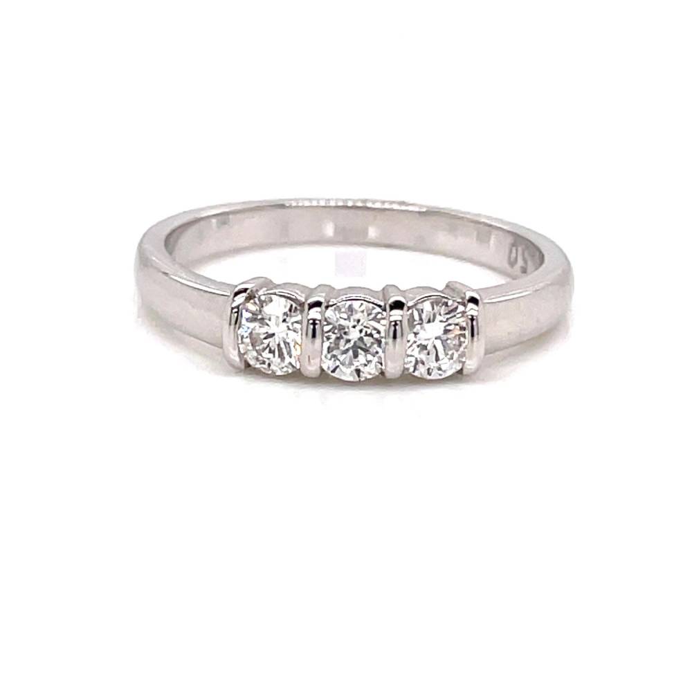 Three round brilliant cut diamonds bar set in a 18ct white gold ring mount. 0.50ct total diamond weight, approximatley G/H colour, Si clarity.
