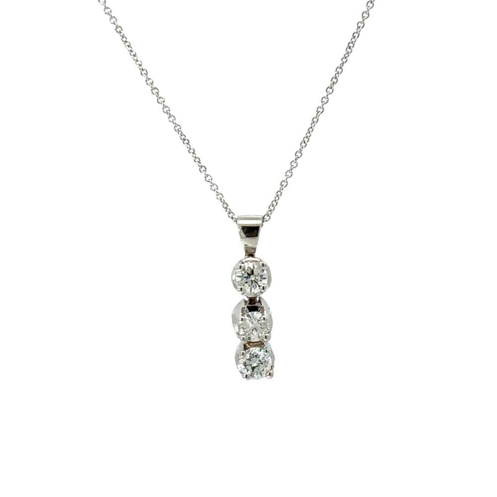 A three stone round brilliant cut diamond drop pendant each in a four claw setting in 18ct white gold on an adjustable chain 38,42 or 46cm. A perfect versitile classic pendant. Matching earrings available. 0.68ct total diamond weight.