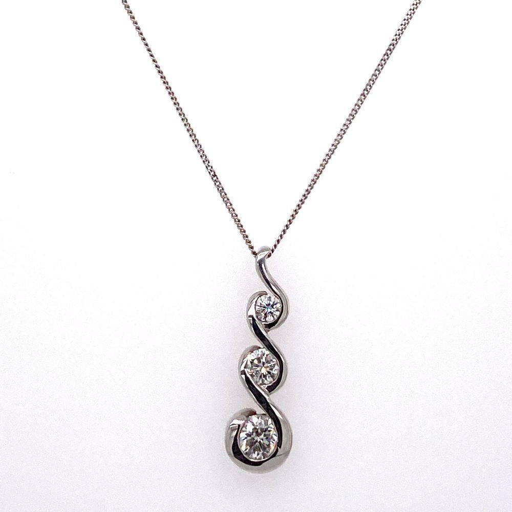 18ct white gold three graduated round brilliant cut diamond drop pendant with a swirl setting. This pendant comes on a white gold curb chain. 0.50ct total diamond weight.
