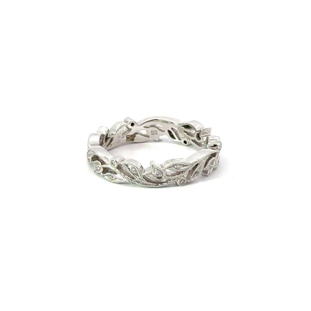 18ct white gold open tulip vine ring set with diamonds with a millegrain edge.