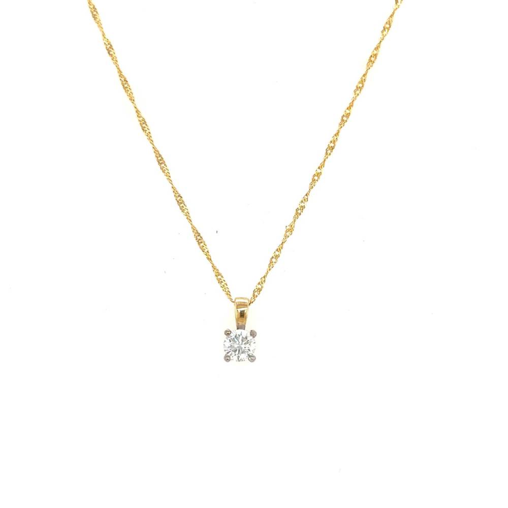 18ct yellow gold four claw set round brilliant cut diamond pendant on a 9ct yellow gold 16″ chain. 0.22ct diamond.