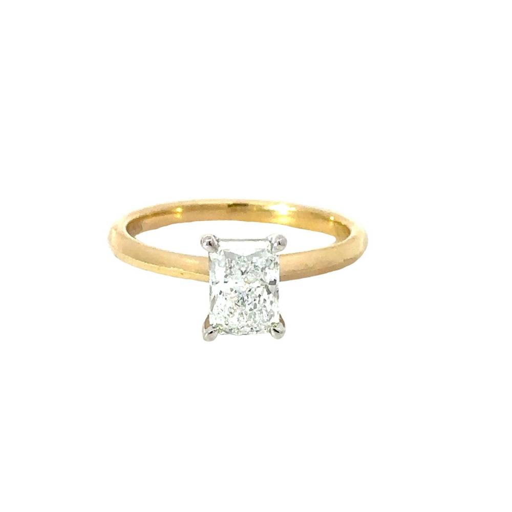 A single radiant cut lab grown diamond four claw set in white gold on a 18ct yellow gold band. 1.01ct lab grown diamond, IGI certificated E colour, VVS2 clarity.
