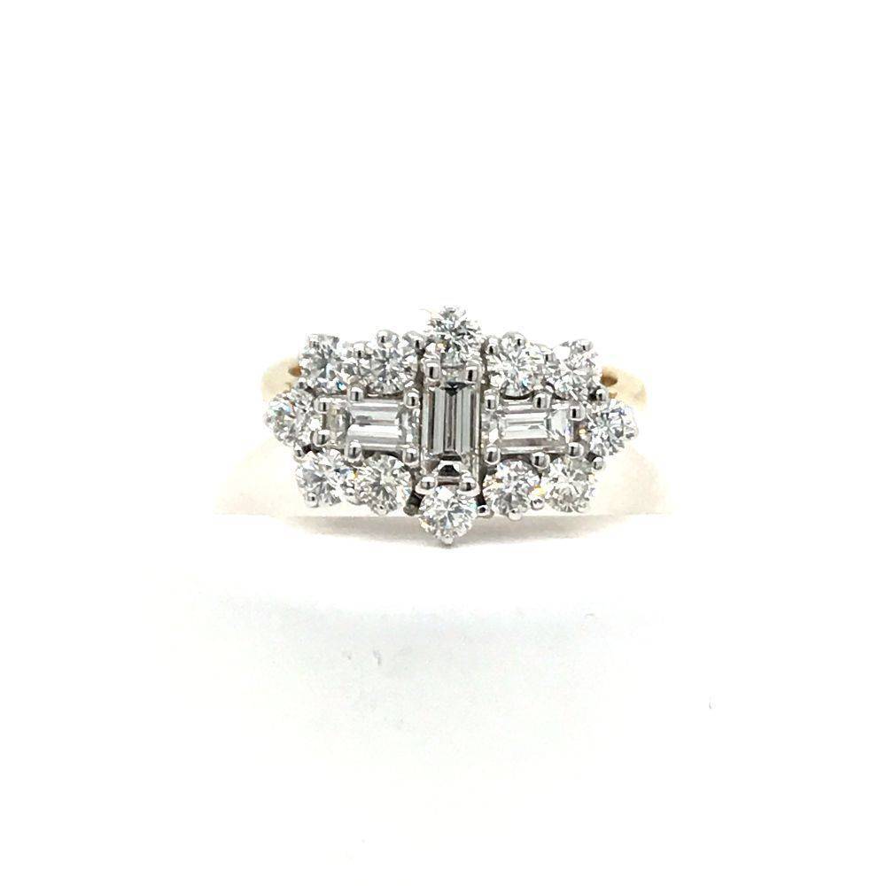 Fifteen stone baguette and round brilliant cut diamond claw set cluster ring, claw set in white gold on a 18ct yellow gold shank. Total diamond weight 1.50ct. G/H colour. Si clarity.