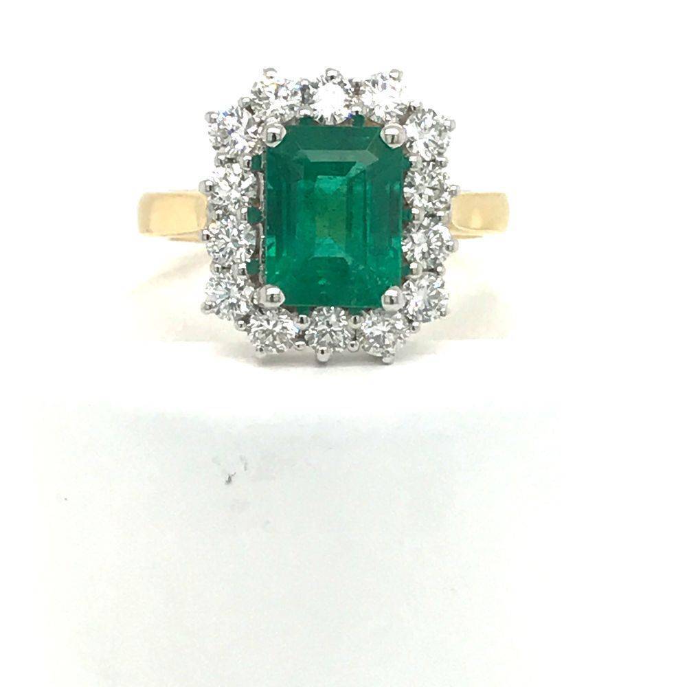 18ct yellow gold emerald and diamond ring. A central emerald surrounded by a cluster of round brilliant cut diamonds all claw set in white gold on a 18ct yellow gold shank. Emerald 2.30ct and diamonds 0.96ct total weight.