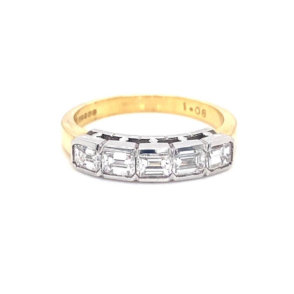 Five emerald cut diamonds rub over set in white gold on a 18ct yellow gold shank. Half eternity style ring. 1.08ct total diamond weight.