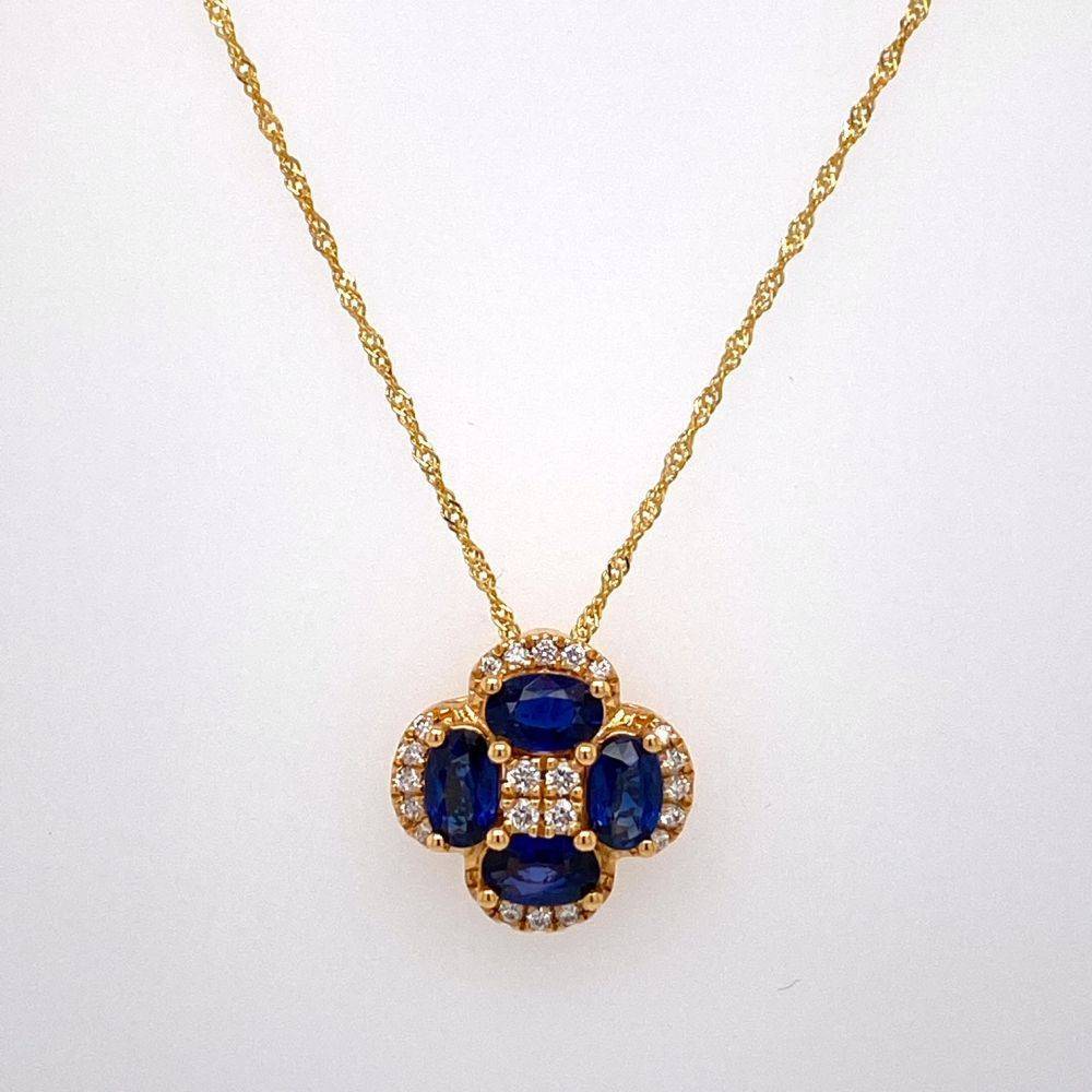 18ct yellow gold four leaf clover sahped pendant set with four oval blue sapphires and round brilliant cut diamonds. This pendant comes on a 16″” 9ct yellow gold twist curb chain. 1.08ct total sapphire weight. 0.13ct total diamond weight.